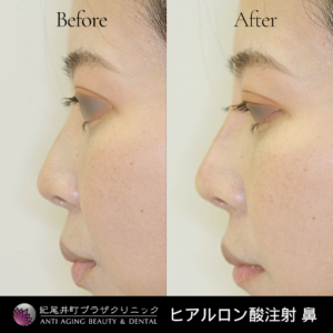 ヒアルロン酸を鼻筋に注入することで、鼻を高くすることができます。鼻筋もスッと通るため、相対的に鼻先が細く見え、小鼻も小さく見えやすくなります。