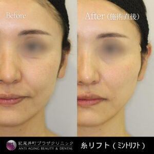 麻酔の注射を使用するため麻酔液による腫れと、多少の内出血がありますが次の日からほとんど腫れは目立ちません。リフティング効果は術後すぐに確認できます。リバイタライジング効果は術後2ヵ月後に皮膚表面や皮膚中間層までの深さで確認することができます。