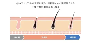 毛髪は、「成長期」と言われる毛髪が太く長くなる時期、「退行期」と言われる毛乳頭細胞の活動が低下して弾力のない細い毛髪となる時期、「休止期」と言われる毛乳頭細胞が次の毛髪になる準備状態となり生えていた毛髪が脱毛していく、およそ5年のヘアサイクル(毛周期)を繰り返しています。