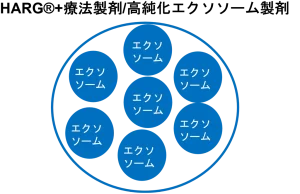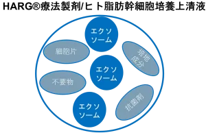 従来のHARG療法では成長因子が主でしたが、HARG+療法で用いられる本製剤はエクソソームが主となりました。これに従来からの成長因子10種やビタミン、アミノ酸、ミネラルなども主要成分として残してあります。