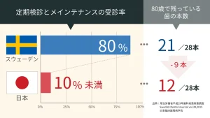 予防歯科の先進国と言われるスウェーデンでは、もともと28本ある歯のうち、80歳で21本もの歯が残っています。日本では何と12本しか残っておらず約9本もの差があり、これではおいしく食べることができません。