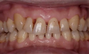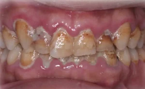 歯の周りを支える歯槽骨と歯肉の病気です。歯周病菌により歯を支えている土台の骨(歯槽骨)が溶かされて、歯肉も痩せて、最終的に支えを失った歯がぐらぐらしてきて抜けてしまいます。溶けた歯槽骨は元に戻ることはありません。歯周病の主な原因は歯周病菌の感染と過度な咬合力です。痛みを伴わないまま進行するので、治療を受けている方は、感染者の数%とも言われ、歯を失う最大の原因(約42%)になっています。