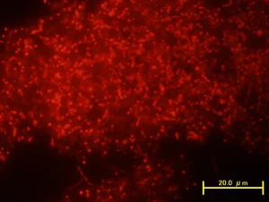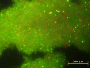蛍光顕微鏡像:緑色は生菌、赤色は死菌
